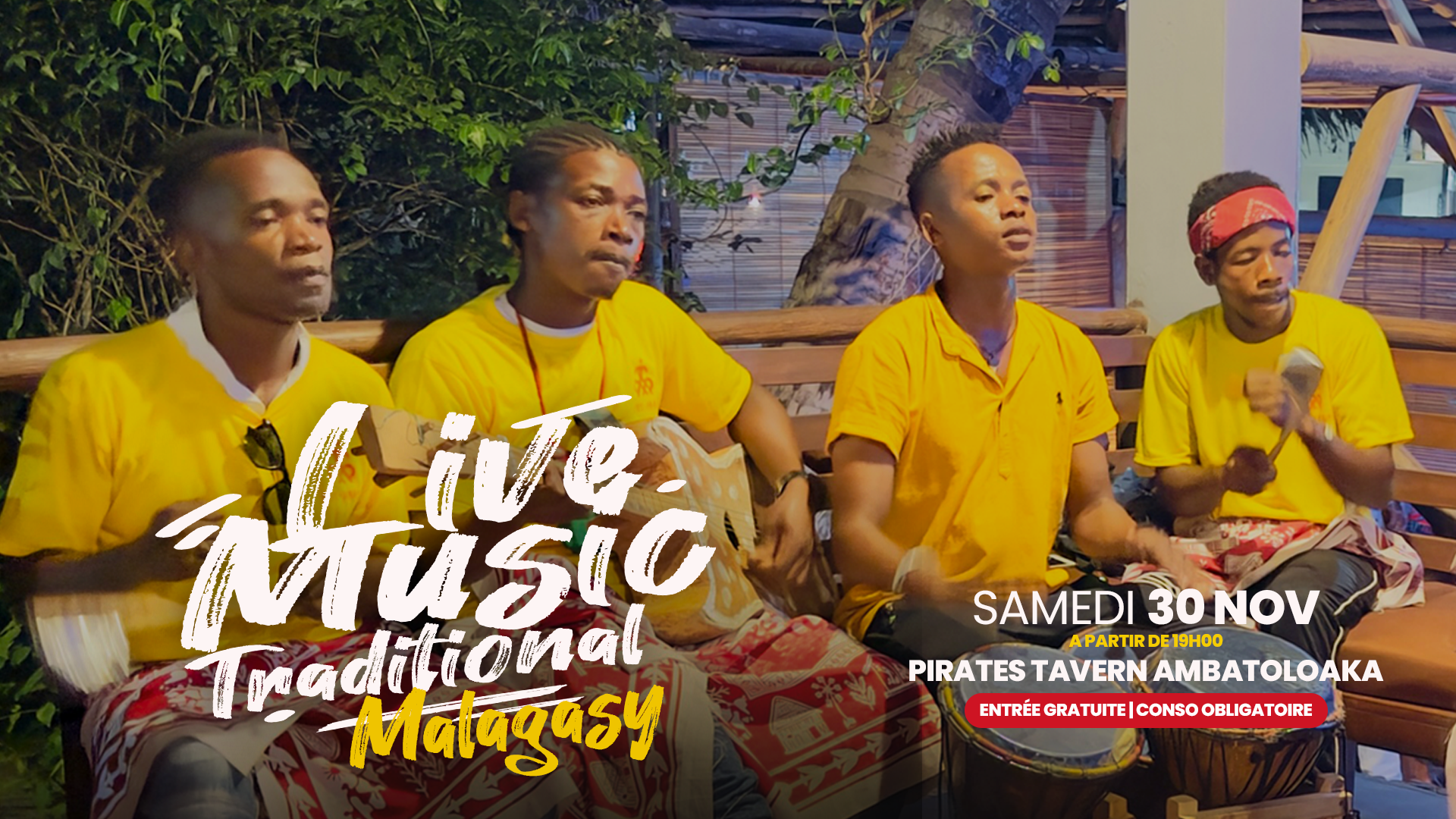 Une soirée musicale typiquement malgache avec le « Groupe Jeune » au cœur d’Ambatoloaka, mettant en avant des instruments traditionnels de Madagascar, accompagnée de diverses animations et suivie d’une ambiance musicale.